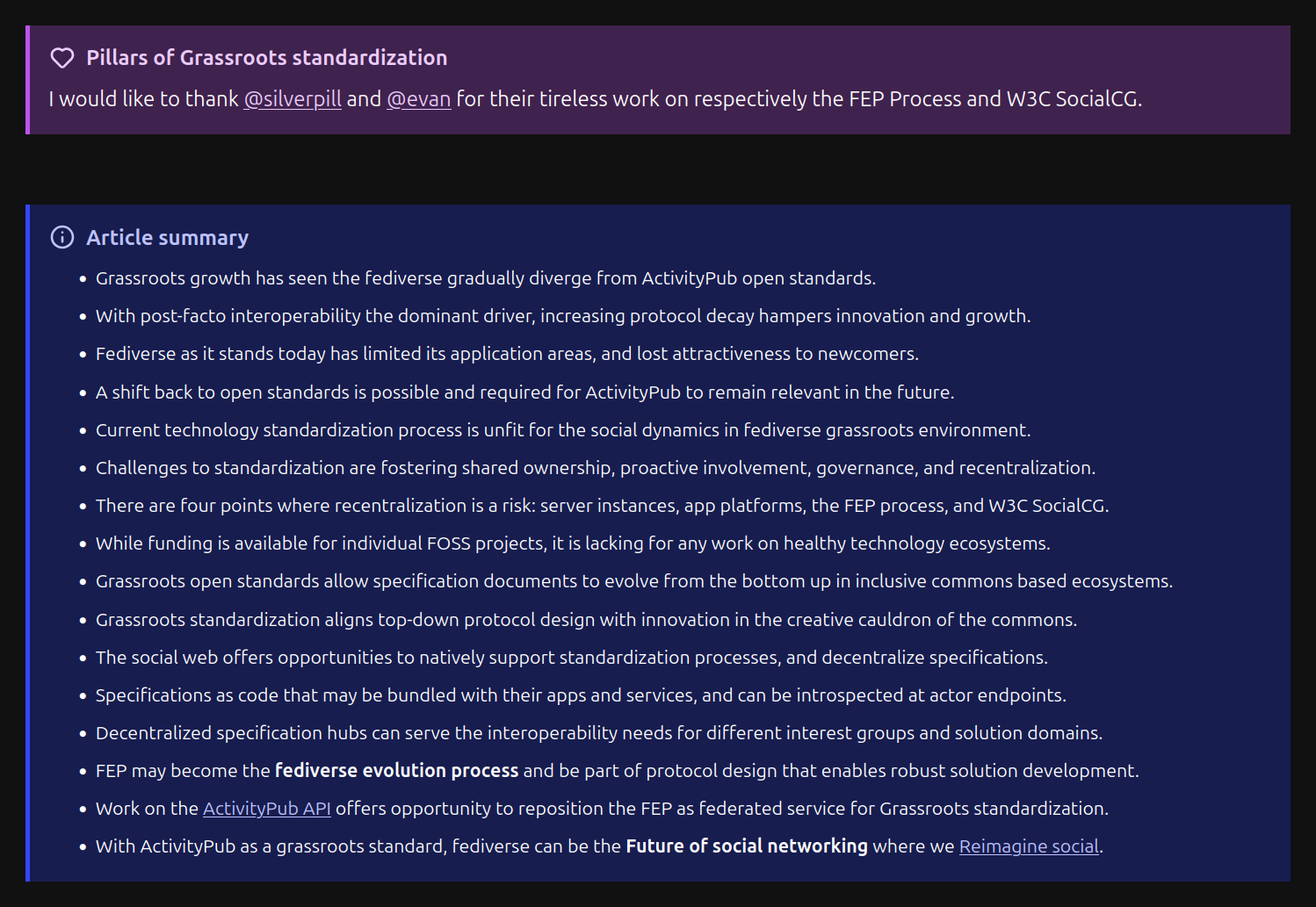I would like to thank @silverpill and @evan for their tireless work on respectively the FEP Process and W3C SocialCG.
