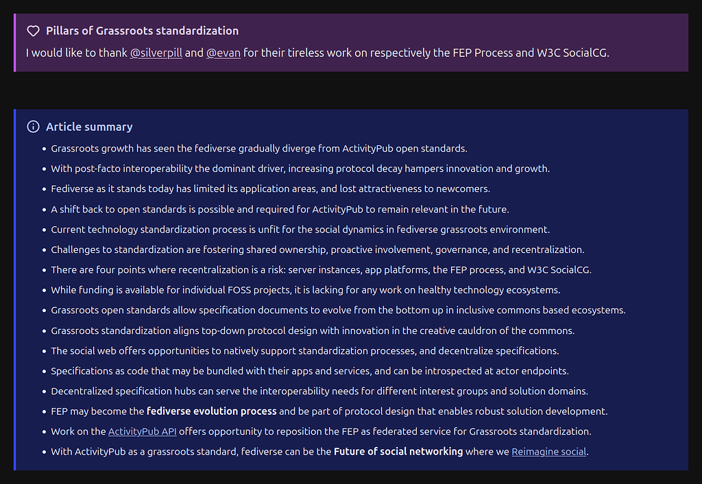 I would like to thank @silverpill and @evan for their tireless work on respectively the FEP Process and W3C SocialCG.